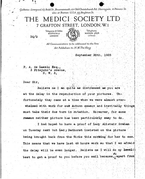 Partial item, continues as DLA105-0057. Nigel de Grey apologises for the delay to the reproduction of de László's pictures [4221][4535].