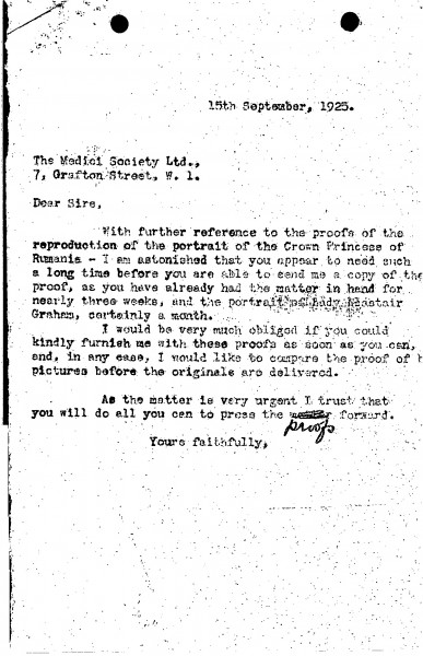 Regarding the delay in preparing proofs for de László's portraits of the Princess of Romania [4221] and Lady Graham [4535].