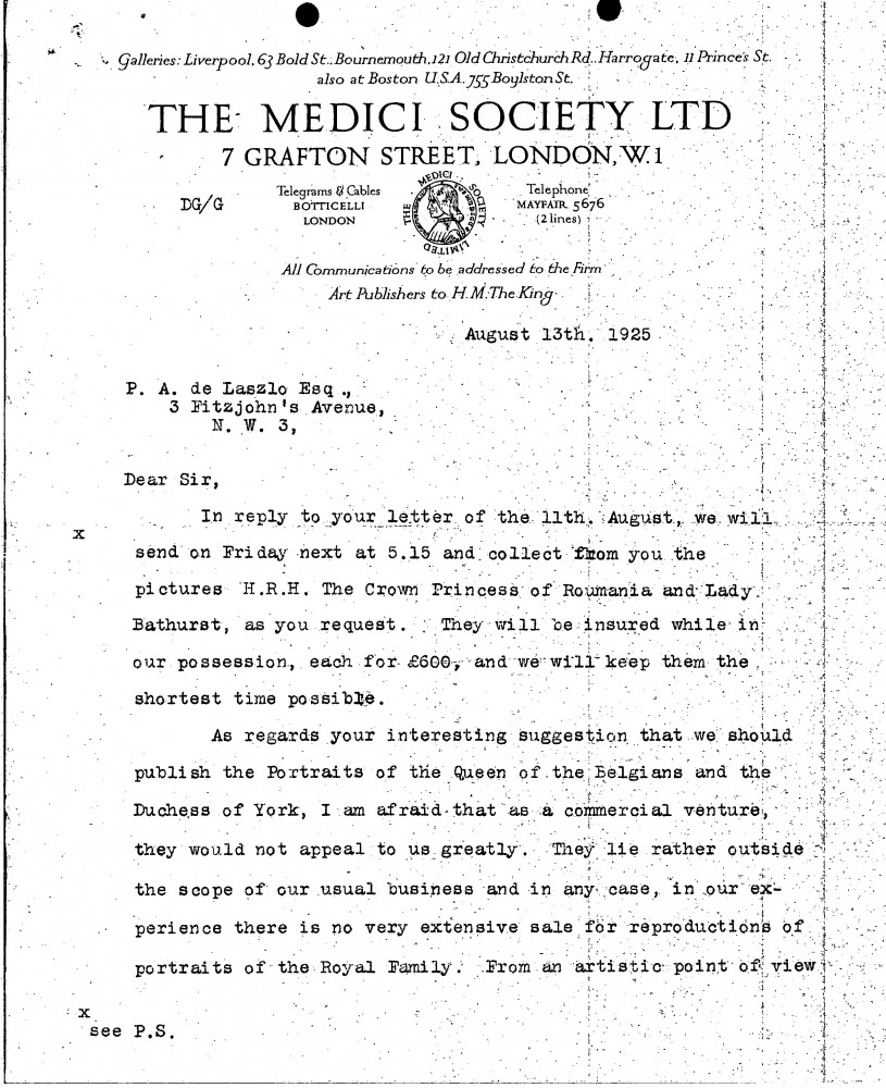 Partial item, continues as DLA105-0069. Regarding the collection and insurance for the portraits of the Crown Princess of Romania [4221] and Lady Graham [4535]. They decline to publish reproductions of Queen Elisabeth of Belgium and the Duchess of York.