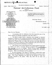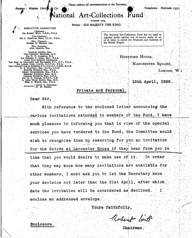 Invitation from the National Art-Collections Fund to a soirée at Lancaster House.