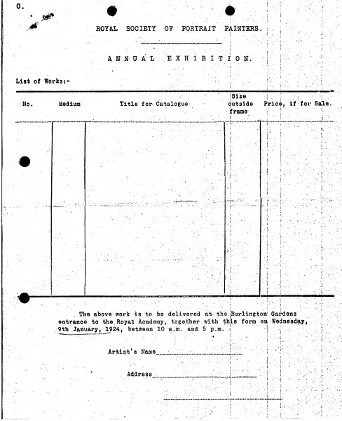 Form for submitting works to the 1924 Annual Exhibition of the Royal Society of Portrait Painters (see related item DLA105-0077).
