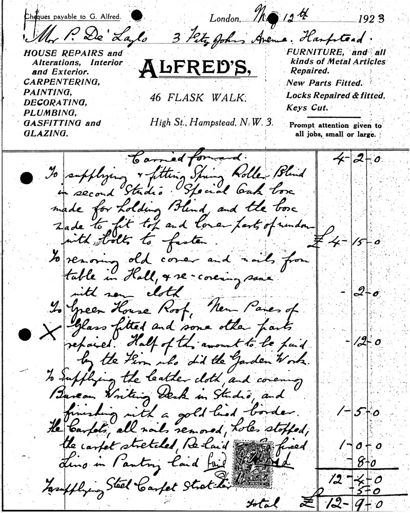 Invoice from Alfred's for work to the studio/house at 3 Fitzjohn's Avenue. Item continued from DLA105-0093.