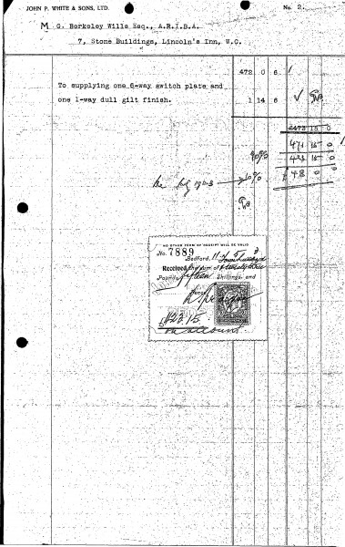 Partial item, continued from DLA105-0096. Invoice from John P. White & Sons Ltd. for work carried out at 3 Fitzjohn's Avenue.