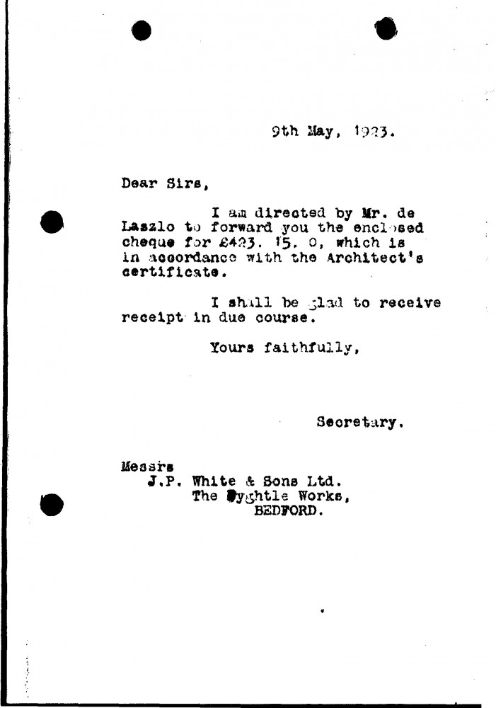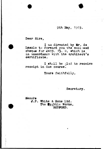 Letter from de László's secretary to John P. White & Sons Ltd., Studio Correspondence Nov 1920 - Apr 1924 Various Art Societ, 105-0098