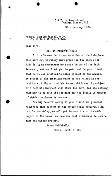 Letter from Cooper, Bake & Co. to Charles Russell & Co., Studio Correspondence Nov 1920 - Apr 1924 Various Art Societ, 105-0119
