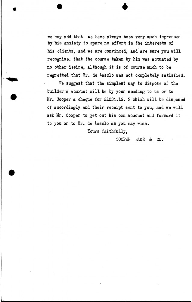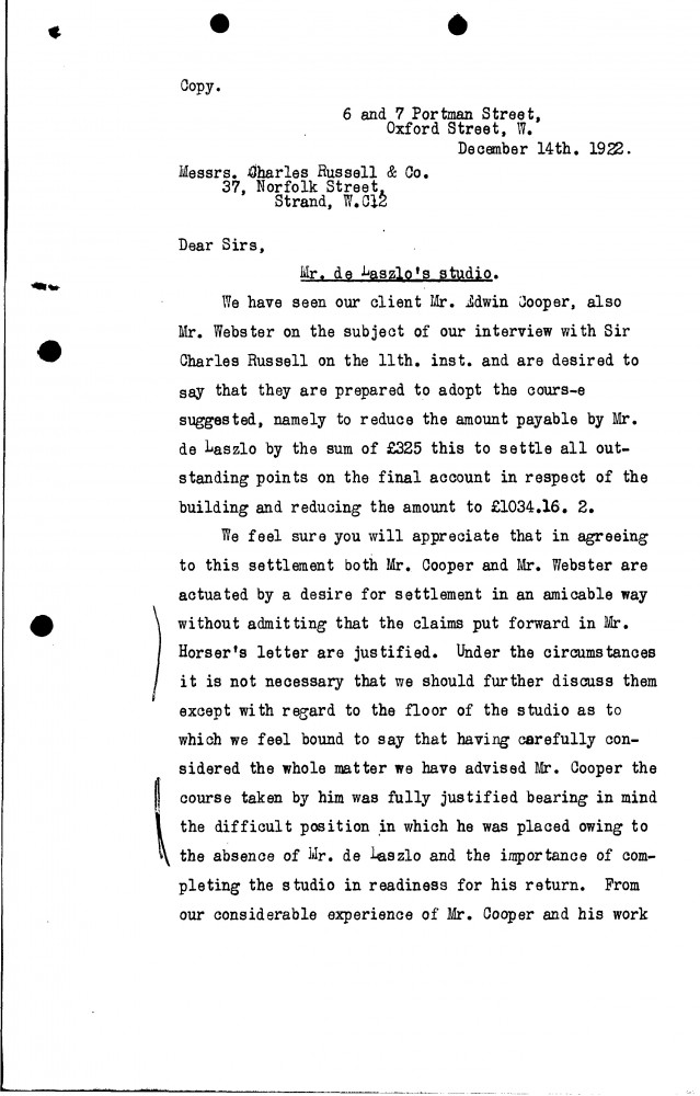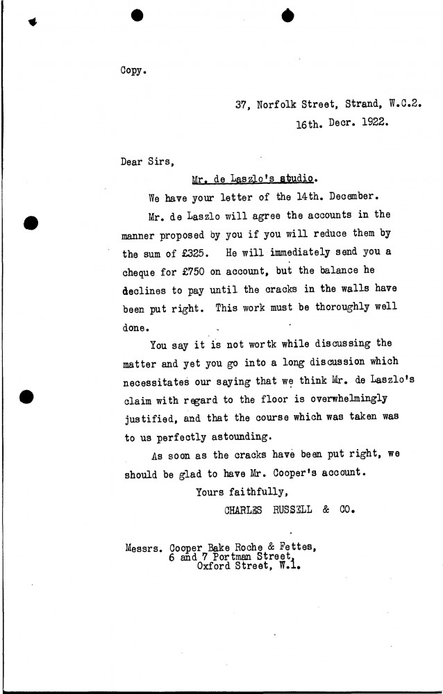 Multiple pieces of correspondence. Legal correspondence between Charles Russell & Co. and Cooper, Bake & Co. concerning a dispute over payment for work to de László's studio at Fitzjohn's Avenue.