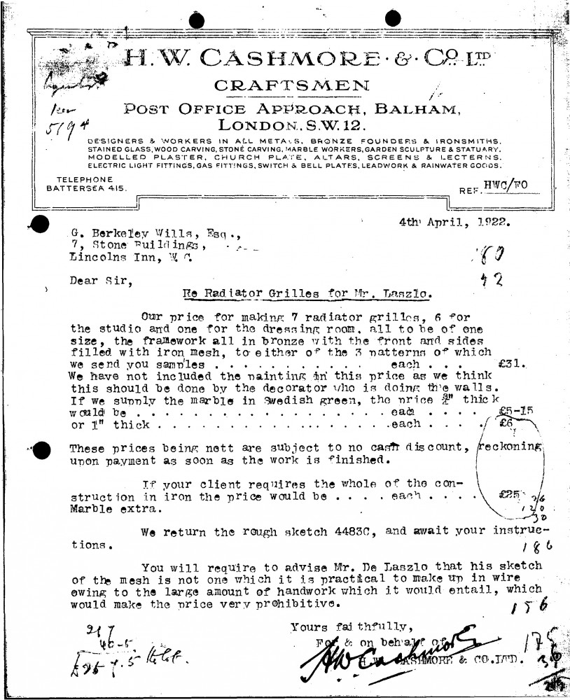 Letter from H. W. Cashmore & Co. Ltd. to Gerald Berkeley Wills. Includes annotations in de László's hand., Studio Correspondence Nov 1920 - Apr 1924 Various Art Societ, 105-0141