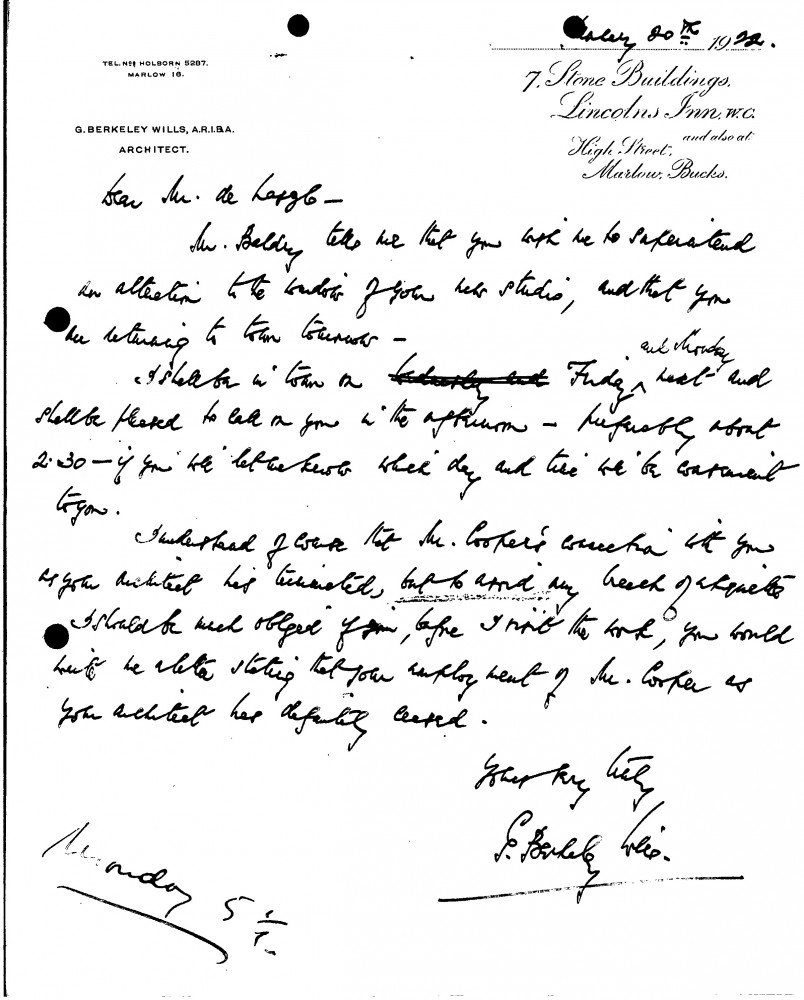 Gerald Berkeley Wills has agreed to supervise work to the new studio at Fitzjohn's Avenue. De László has terminated his employment of Sir Edwin Cooper, architect.