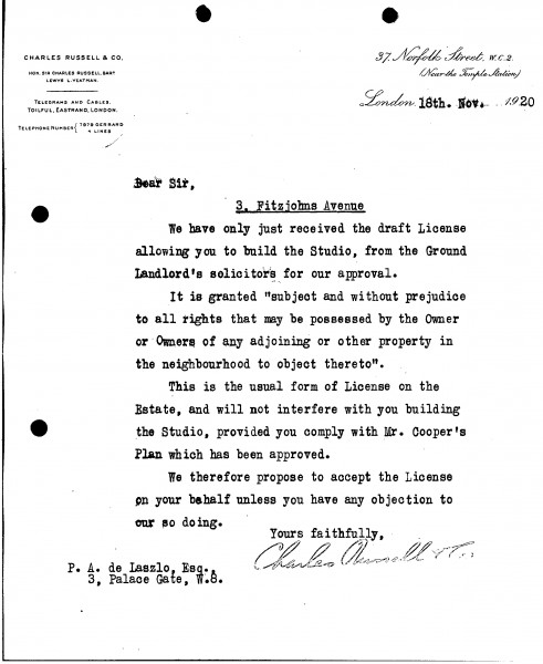 Confirming receipt of the draft license permitting the building of a studio at 3 Fitzjohn's Avenue.