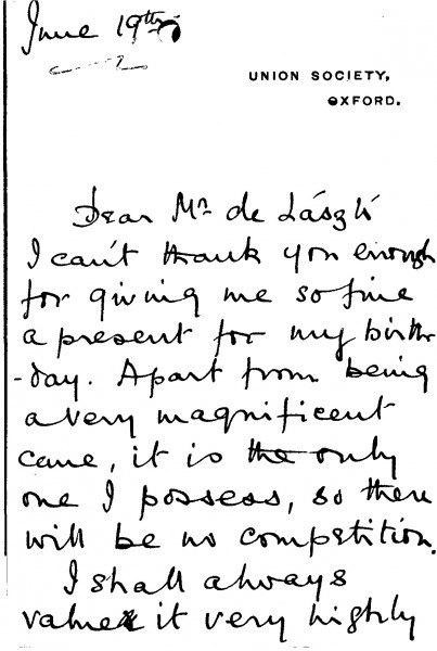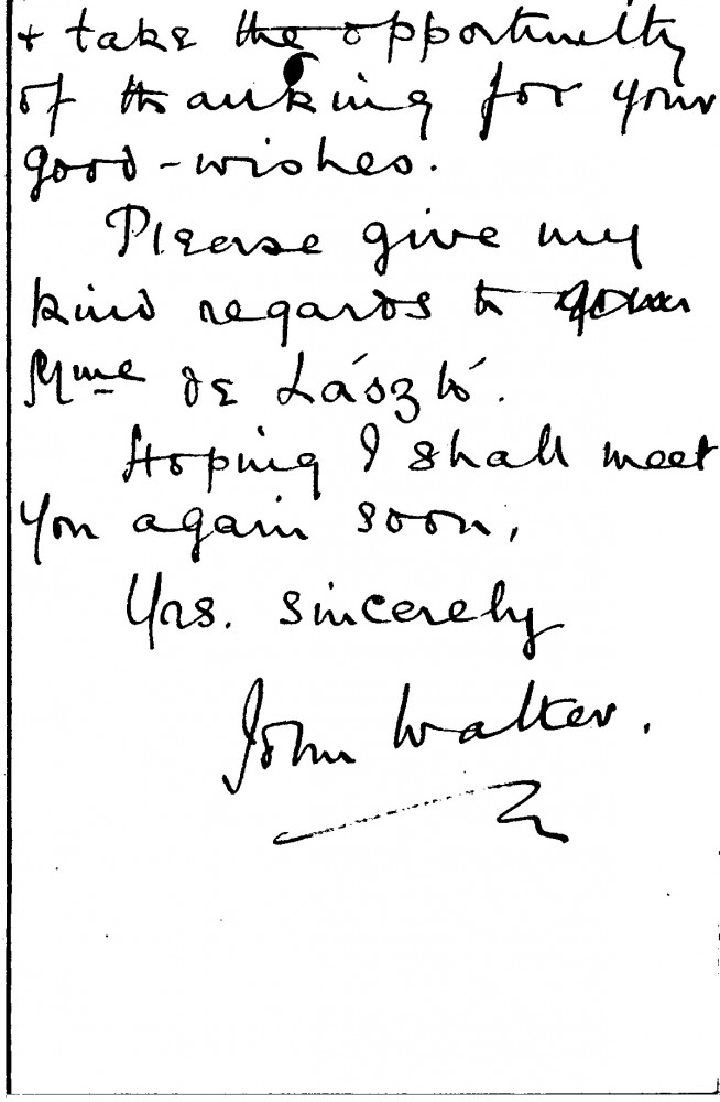 John Walter thanks de László for the birthday present (a cane) [sender to be confirmed]
