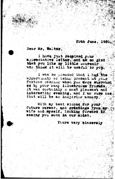 De László is pleased John Walter liked the present (a cane) and that he could attend the latter's party [recipient to be confirmed]