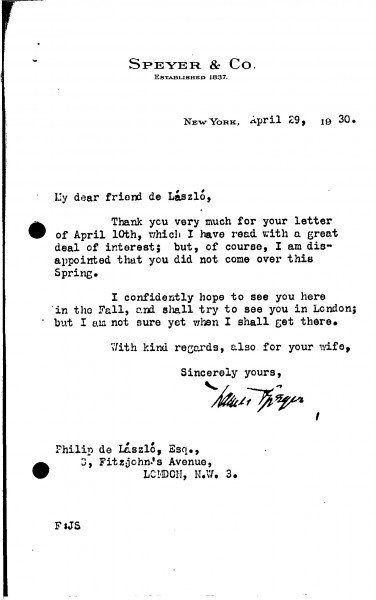 James Speyer thanks de László for his letter; disappointed not to see the artist in America this spring but hopes to see him in London in the fall