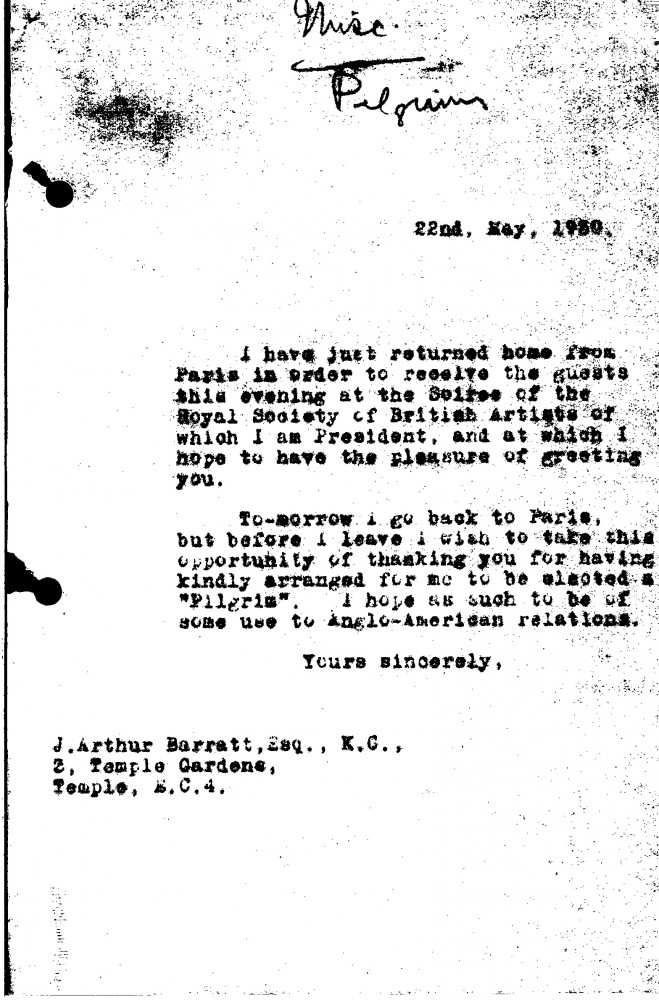 De László hopes to see J. Arthur Barratt at the RBA soirée; thanks Barratt for arranging to have him elected a "Pilgrim", and hopes "to be of some use to Anglo-American relations"