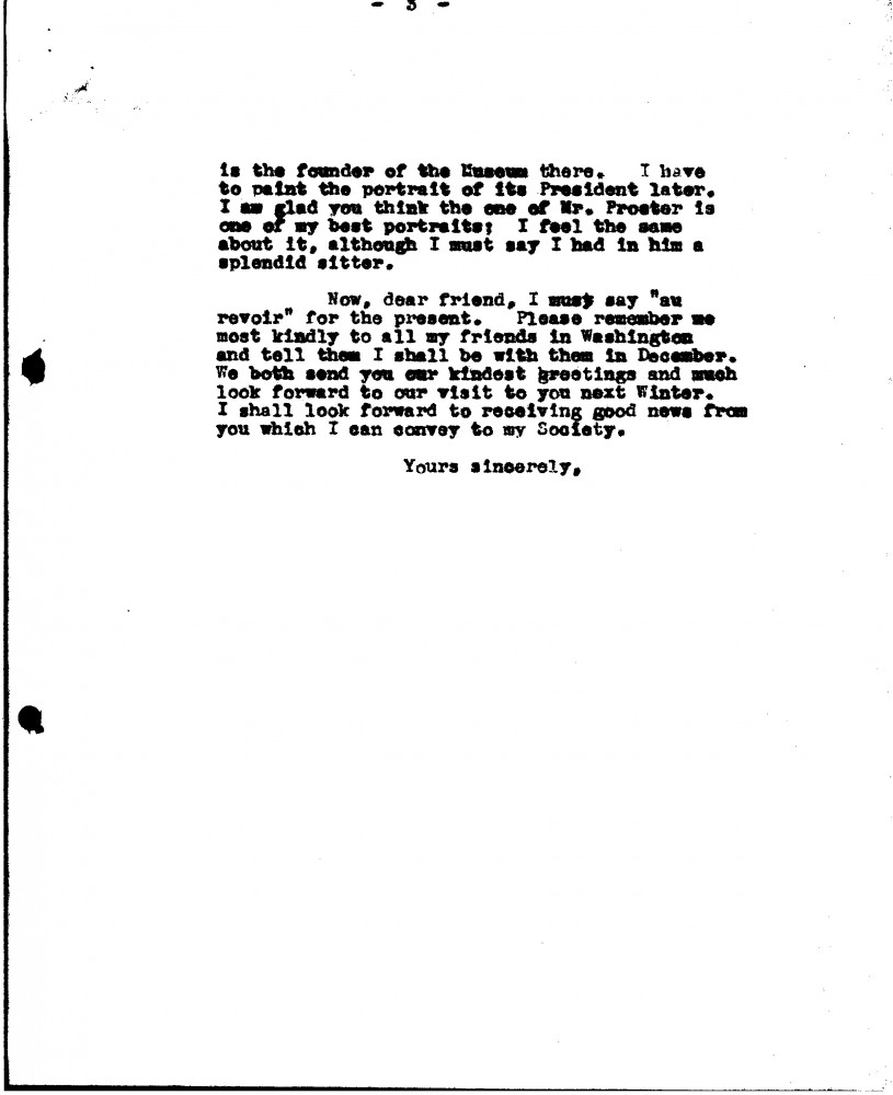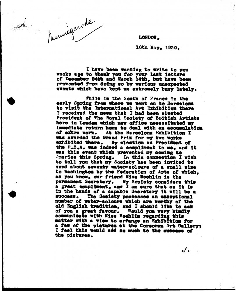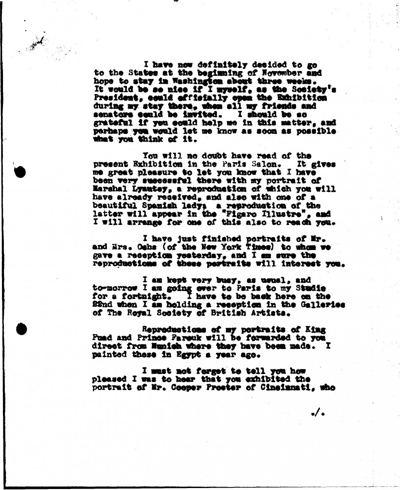 De László writes to C. Powell Minnigerode about his election as President of the RBA; Grand Prix at the Barcelona exhibition; RBA's invitation from American Federation of Arts to send watercolours to an exh in Washington–will Minnigerode arrange with Miss Mechlin for some to be shown at the Corcoran Gallery; travel plans to America; success at Paris salon with portraits [6118][6875]; mentions portraits of the Ochs [6480][6486]; King Fouad [4094][4099][110671][113256] & Prince Farouk [4122]; William Cooper Procter [111048]; will paint portrait of the Cincinnati Museum's President