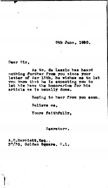 Letter from de László's secretary to Albert E. Marriott (pseud. Netley Lucas), Supplementary Arranged by Years Only 1930-1932, 019-0044