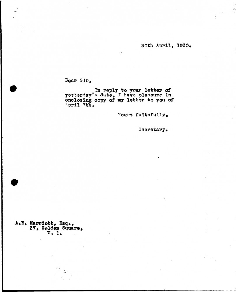 As requested, de László's secretary encloses a copy of a letter dated 7 April [1930] to Albert E. Marriott (pseud. Netley Lucas)