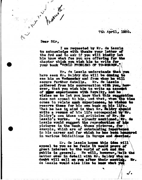 Letter from de László's secretary to Albert E. Marriott (pseud. Netley Lucas), Supplementary Arranged by Years Only 1930-1932, 019-0052