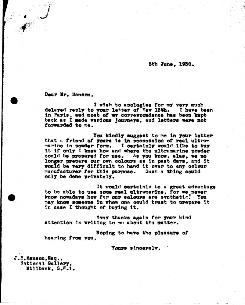 De László is interested in the ultramarine powder that James Bolivar Manson's friend has found (see DLA019-0060); he would like to know how and where it could be prepared for use