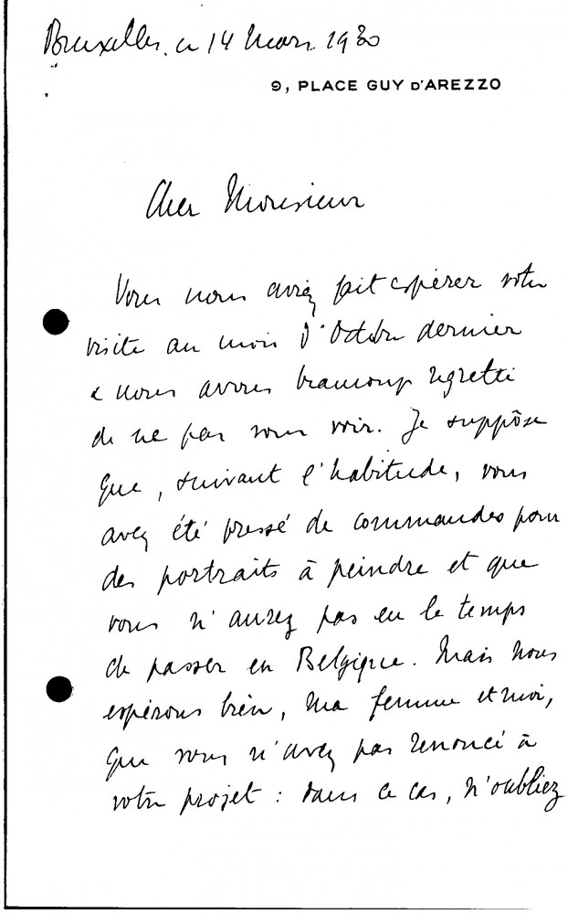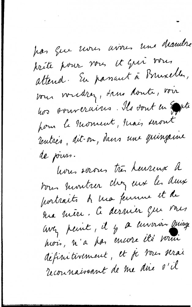 Count Raoul de Liedekerke hopes de László will visit Brussels soon; he would be happy to show the artist the portraits of his wife [4837] and mother [4833]; asks whether the latter portrait needs to be varnished