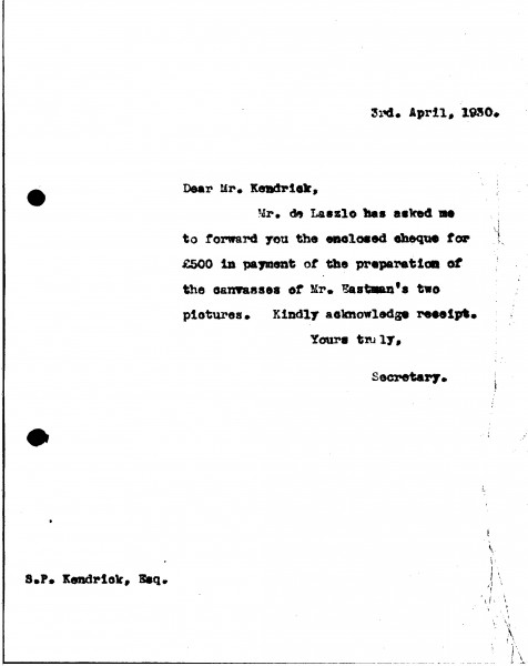 De László's secretary forwards a cheque for £500 to Sydney Percy Kendrick for the preparation of two canvases for George Washington Eastman [5001][5004]