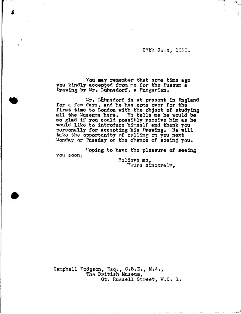 Hungarian artist Károly Lühnsdorf is in London, and would like to personally thank Campbell Dodgson for accepting his drawing into the British Museum's collection