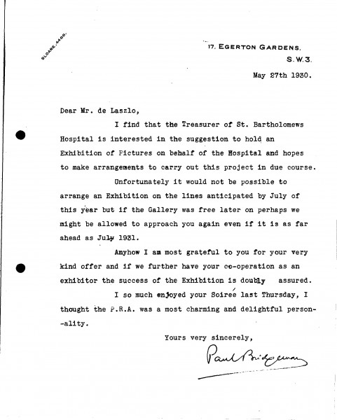 Bridgeman thanks de László for the offer to hold the charity exhibition at the RBA's gallery. The Hospital's Treasurer is interested in the idea; since there is not enough time to organise it for July [1930], Bridgeman hopes to approach de László at a future date