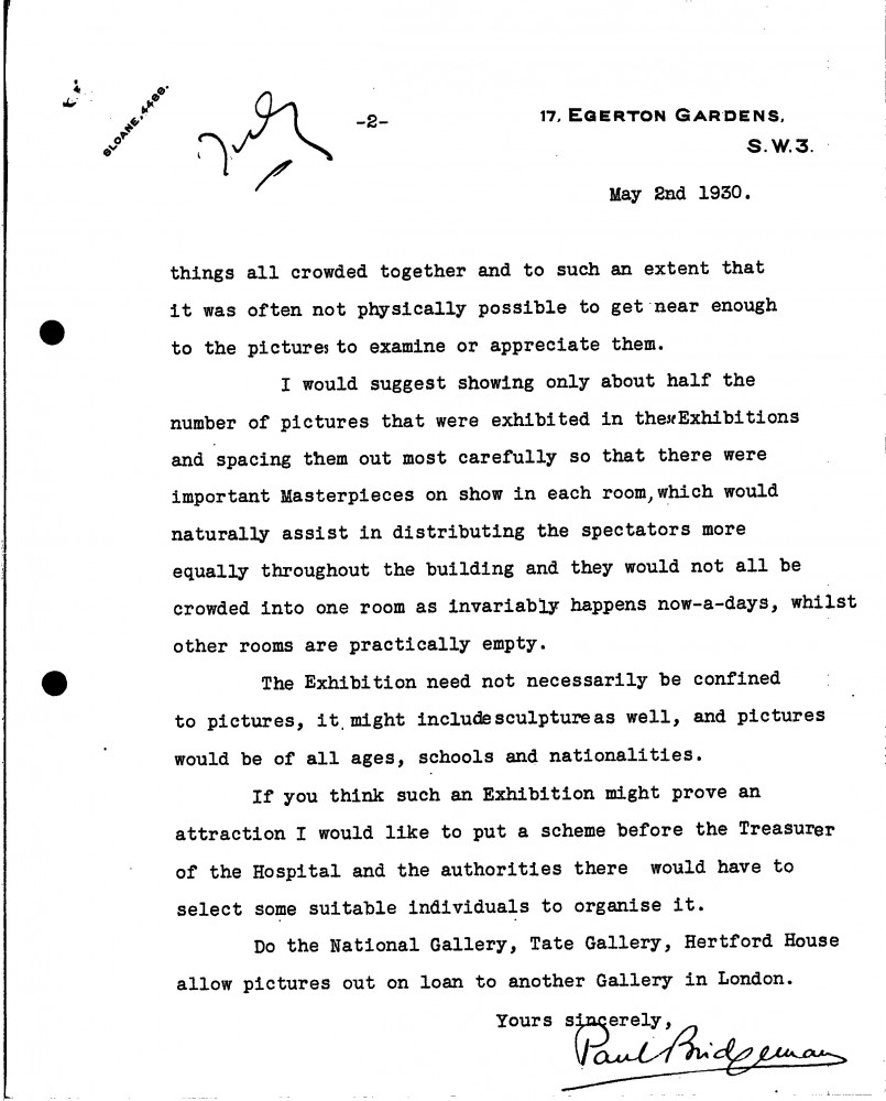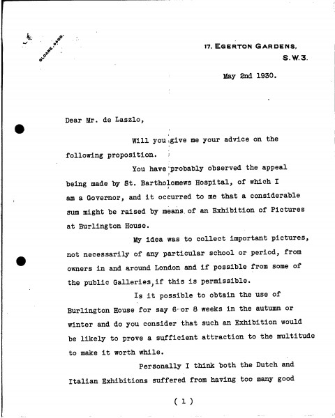 Paul Bridgeman asks whether de László thinks the idea of holding an exhibition in Burlington House to raise money for St. Bartholomew's Hospital is a sound one