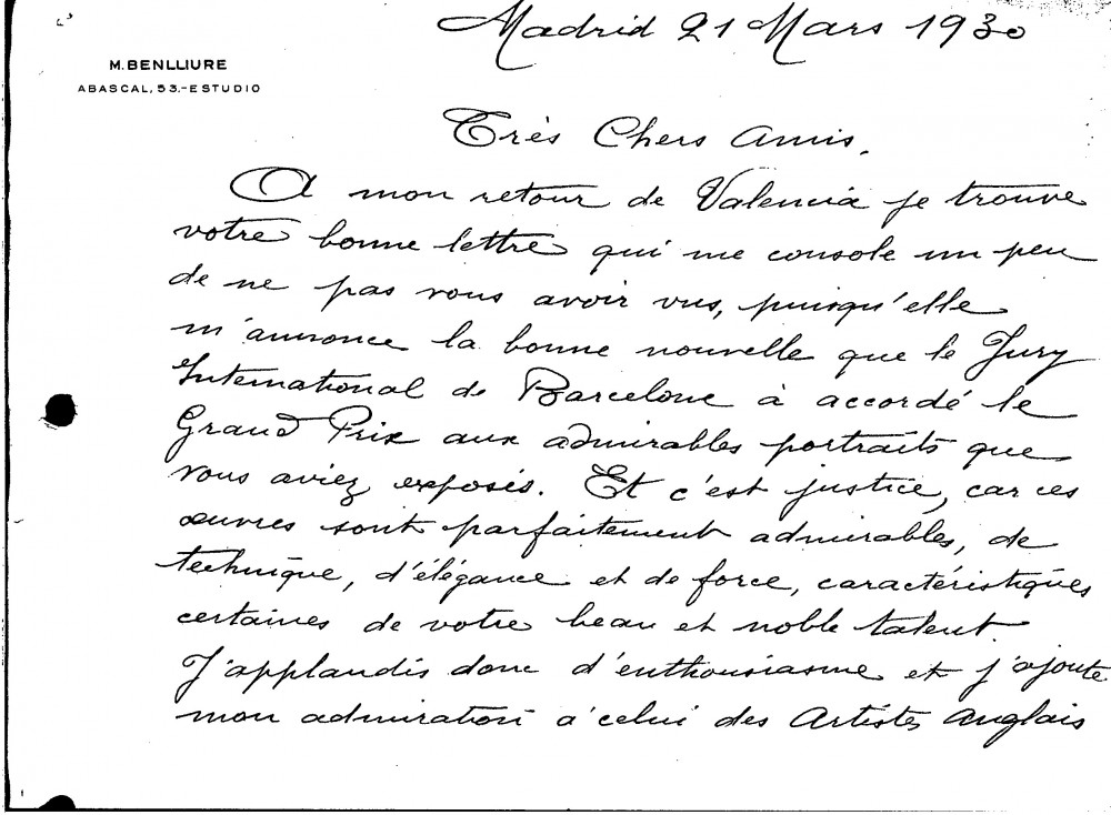 Letter from Mariano Benlliure Gil to Philip and Lucy de László, Supplementary Arranged by Years Only 1930-1932, 019-0097