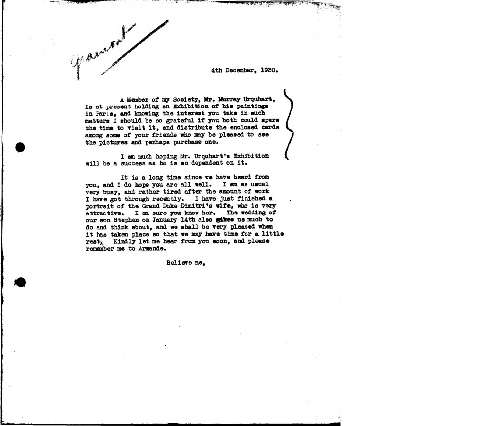 De László asks the duc de Guiche to visit Murray Urquhart's exhibition in Paris and to distribute cards amongst his friends. De László has been busy – recently finished a portrait of the Grand Duke Dmitri's wife, Princess Ilyinsky [5723]. Mentions Stephen de Laszlo's forthcoming wedding