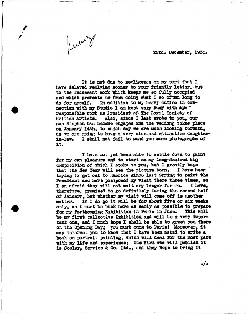 De László complains about how busy he has been; hopes to paint for pleasure and start his "long-desired big composition"; attempts to get to America to paint President Hoover; important forthcoming exhibition in Paris (Charpentier, 1931); has been asked to write a book on portrait painting to be published by Seeley; exhibition of the Prince of Piedmont's portrait [7890] in Venice; general family news including Stephen's forthcoming wedding