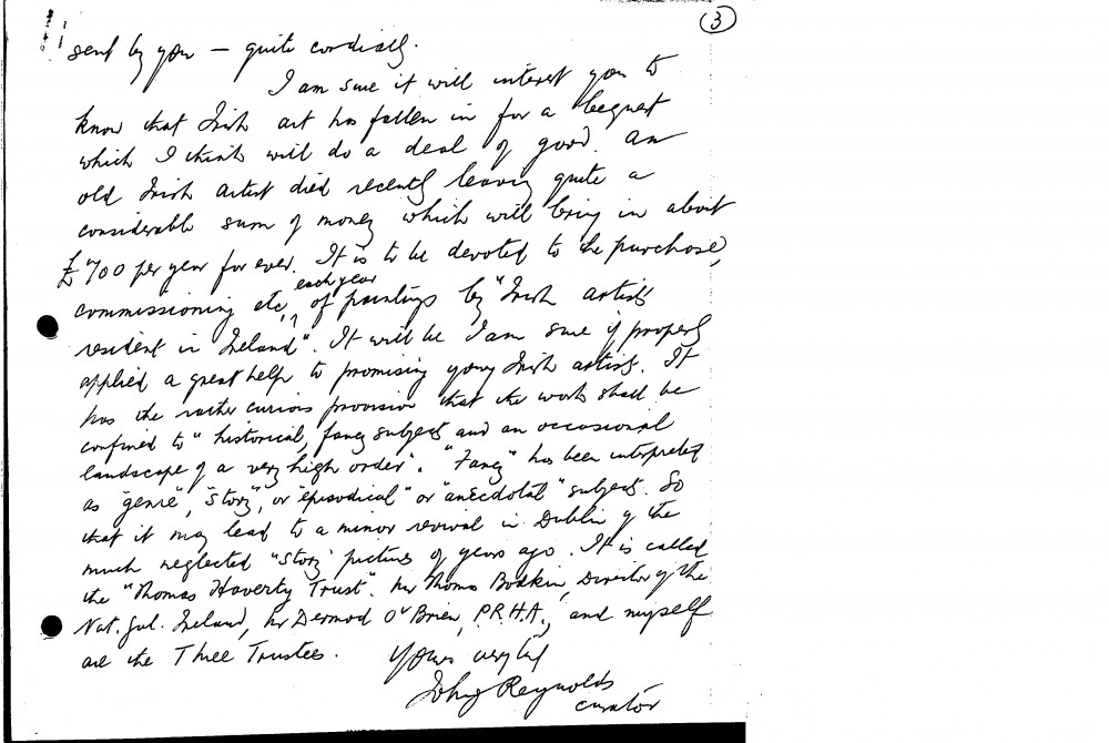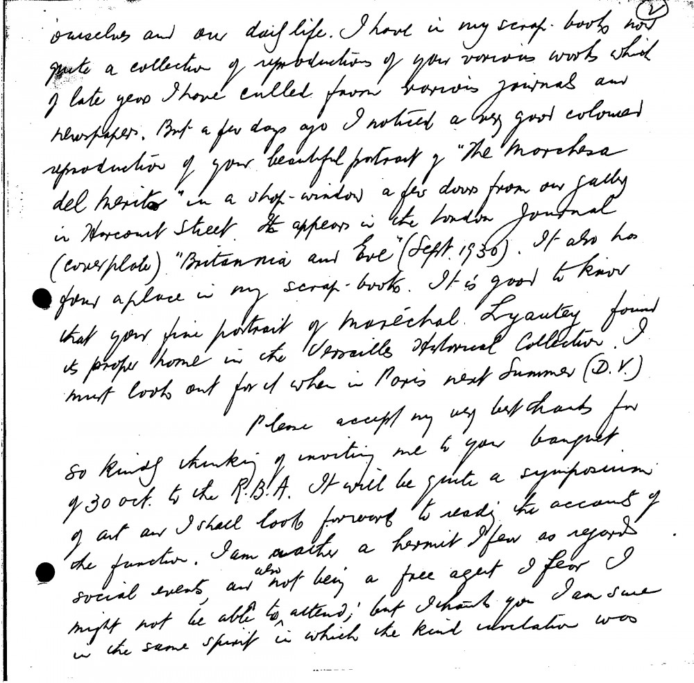 Reynolds has a scapbook containing a collection of reproductions of de László's works. He is unable to attend de László's banquet on 30 October. Reference to the "Thomas Haverty Trust", which he hopes will "do a deal of good" for Irish art, and "lead to a minor revival in Dublin of the much neglected 'story' pictures of years ago"