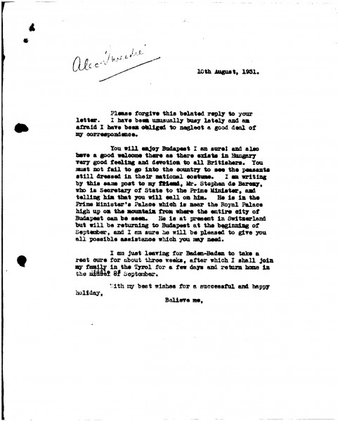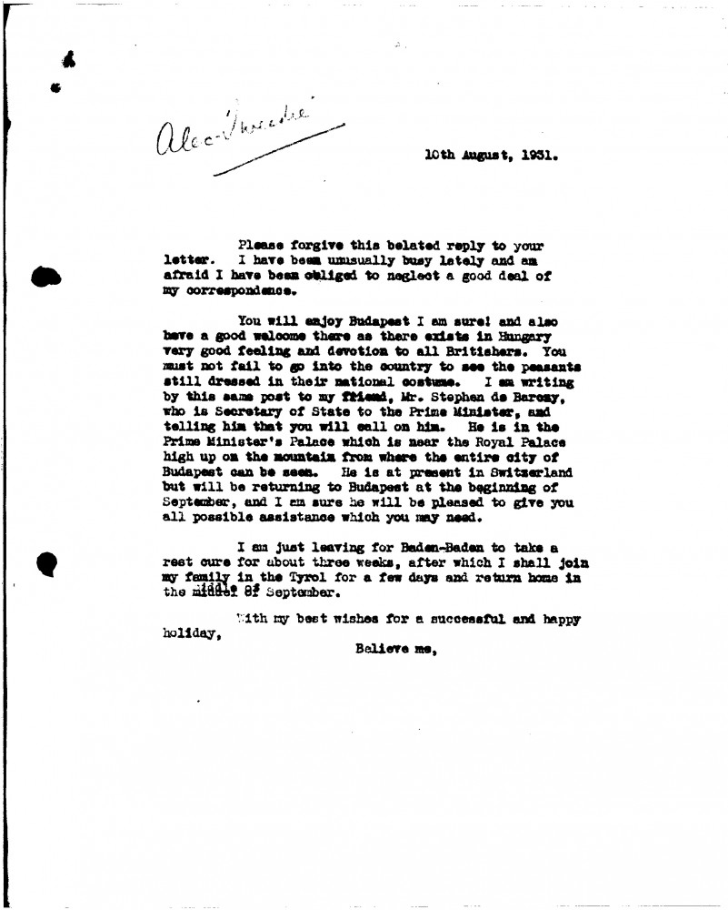 De László apologies for his belated reply; he will send a letter of introduction to István Bárczy; mentions his own travel plans