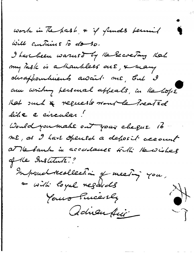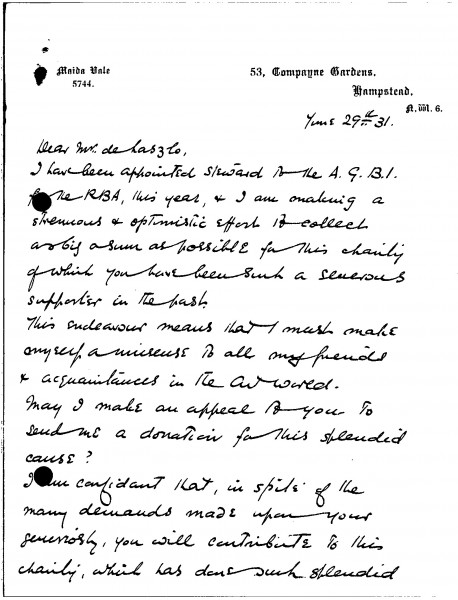 Adrian Hill asks de László if he will donate to the Artists' General Benevolent Institution.