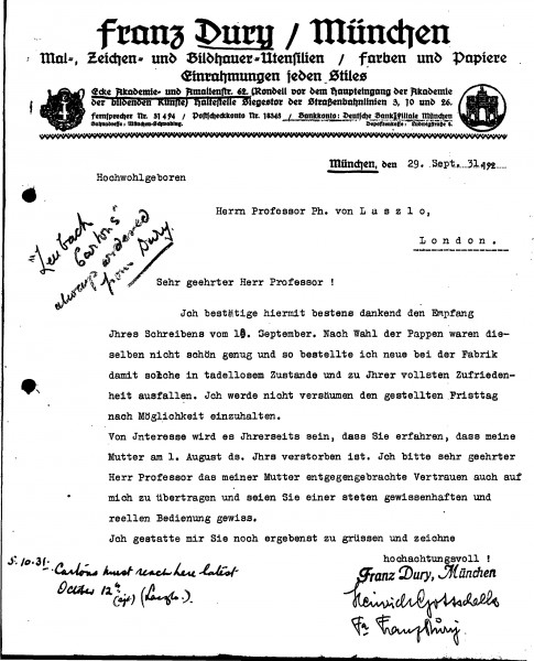 Heinrich Gottschalk (of Franz Dury, Munich) confirms receipt of de László's letter. The boards (“Pappen”) were not good enough and he has had to order new ones. Gottschalk's mother died recently and he hope that their professional relationship will continue as before. There is also a note in other hand: "Lenbach Cartons' always ordered from Dury".