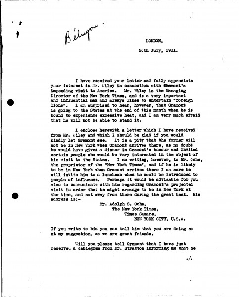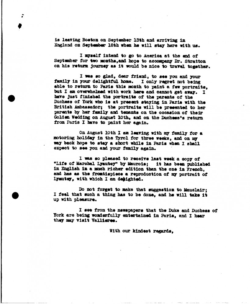 De László provides introductions to Louis Wiley and Adolph Ochs of The New York Times for the duc de Guiche. Mentions Dr Stratton and travel plans. Has just finished portraits of the Duchess of York's parents [11641][11642] and will soon paint the Duchess [12183]. Reference to a suggestion for Mauclair.