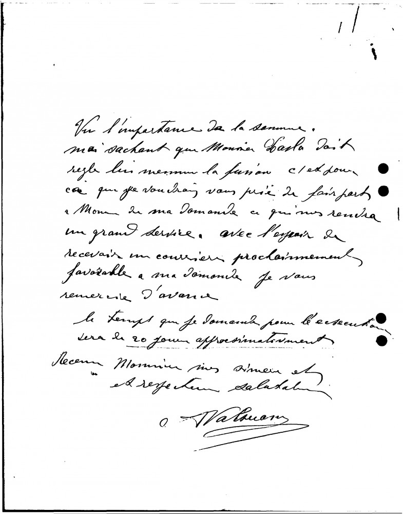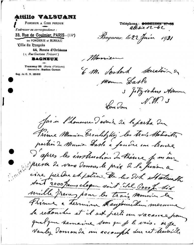 Valsuani, who has been charged by Prince Troubetzkoy to cast in bronze his sculpture of de László [11339], requests payment of 2000 francs per statuette; the work will take 20 days.