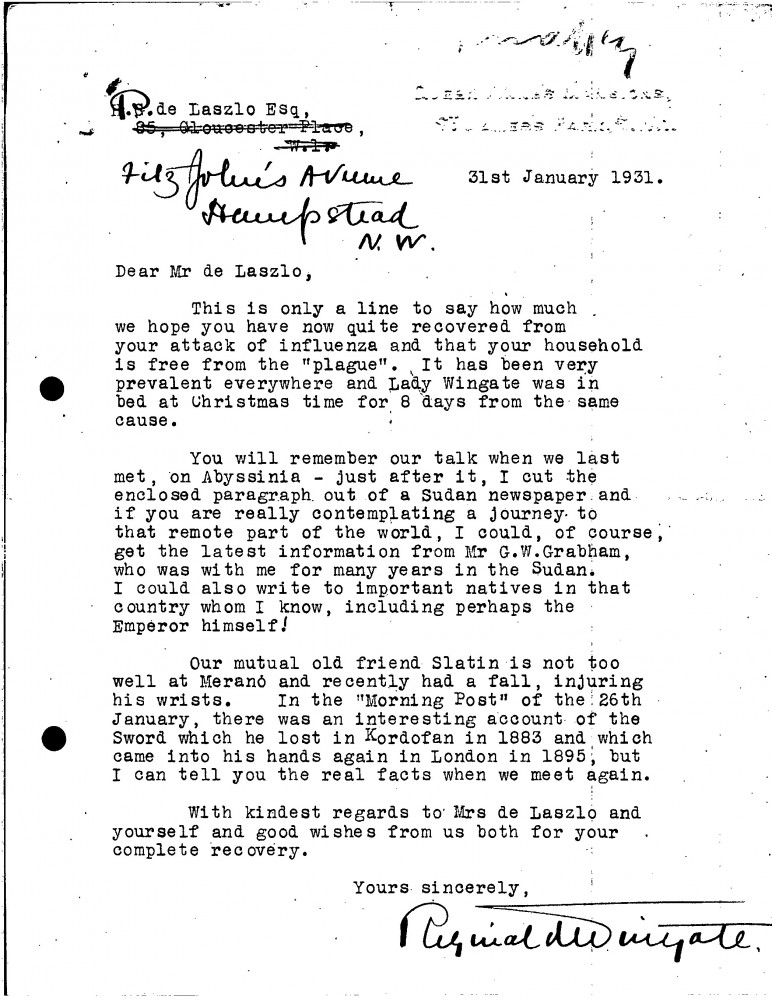 Following their conversation, Reginald Wingate encloses a paragraph from a Sudanese newspaper and offers to obtain information/introductions for de László if he is seriously intending to visit Abyssinia. Their mutual friend Slatin Pasha is unwell.