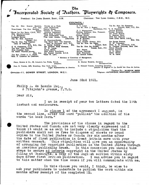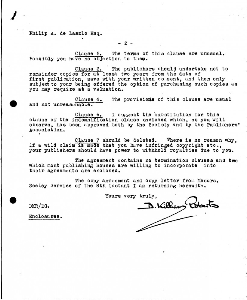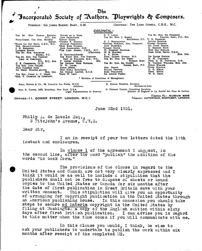 D. Kilham Roberts, Secretary of the Incorporated Society of Authors, Playwrights & Composers, gives de László legal advise pertaining to the publication of a book.