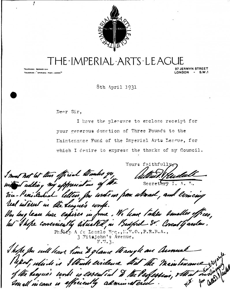 Arthur D. Rendall thanks de László for his donation to the Imperial Arts League.