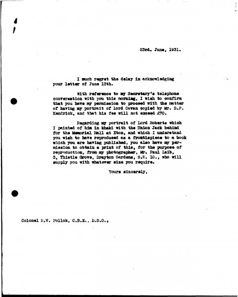 De László agrees to a copy of his portrait of Lord Cavan [6924] to be painted by Sydney Percy Kendrick at a fee not exceeding £70. He also gives permission for the reproduction of his portrait of Lord Roberts [6924].