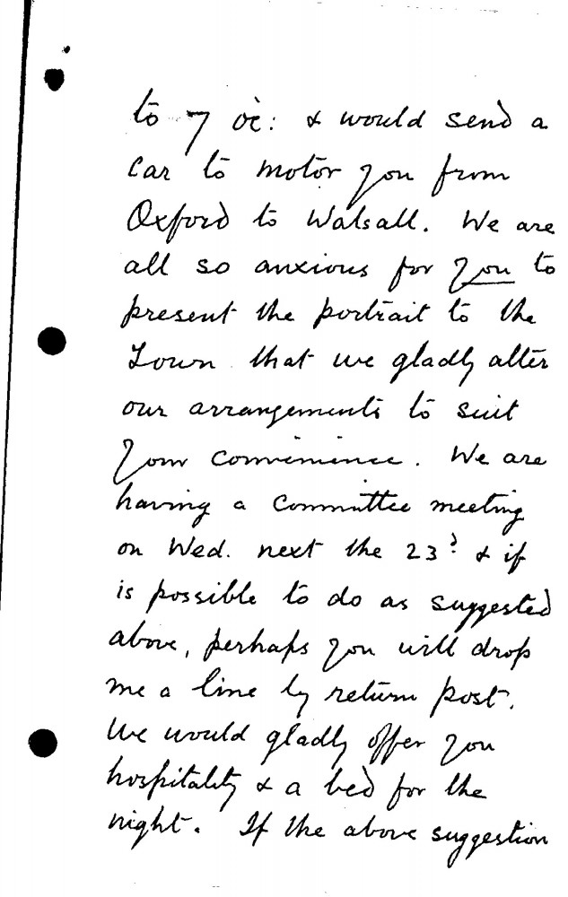 Alfred Moss, Honorary Secretary of the Jerome Commemoration Committee, is anxious for de László to attend the unveiling ceremony of the commissioned copy [111428] of his portrait of Jerome K. Jerome [5841]; the timing or date of the presentation can be altered to suit de László.