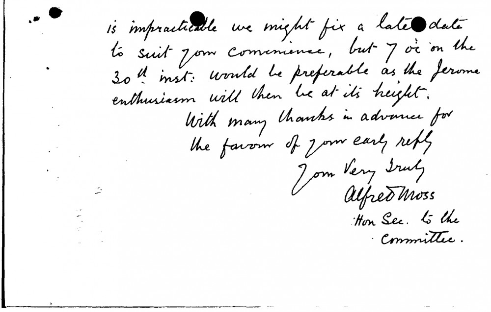 Letter from Alfred Moss, Honorary Secretary of the Jerome Commemoration Committee, to de László, Supplementary Arranged by Years Only 1930-1932, 019-0176
