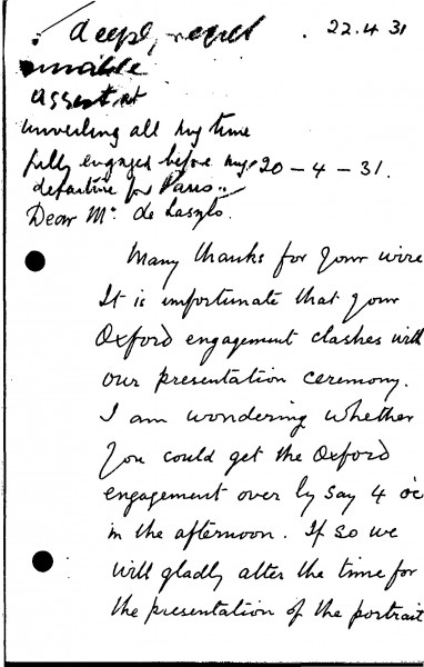 Letter from de László to Alfred Moss, Honorary Secretary of the Jerome Commemoration Committee, Supplementary Arranged by Years Only 1930-1932, 019-0175
