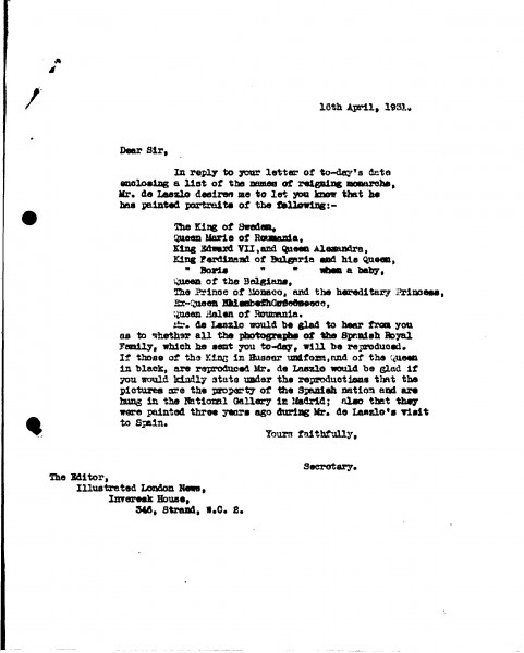 Letter from de László's secretary to the editor of the Illustrated London News, Supplementary Arranged by Years Only 1930-1932, 019-0178