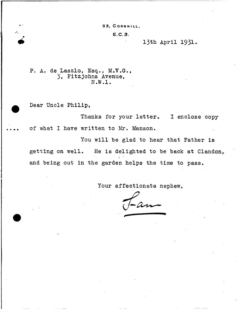 Samuel Guinness thanks de László for his letter and encloses a copy of his letter to James Bolivar Manson (see DLA019-0186). Sam's father, Howard, is doing well.