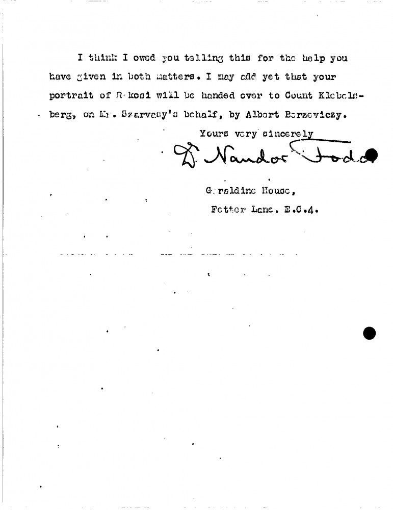 Fodor confirms Szarvassy's completion of the purchase of de László's portrait of Jenő Rákosi for the Hungarian nation [6729]; the portrait will be handed over to Count Klebelsberg by Albert Berzeviczy. The artist's portrait of Lord Rothermere was admired when on view at the Ritz.