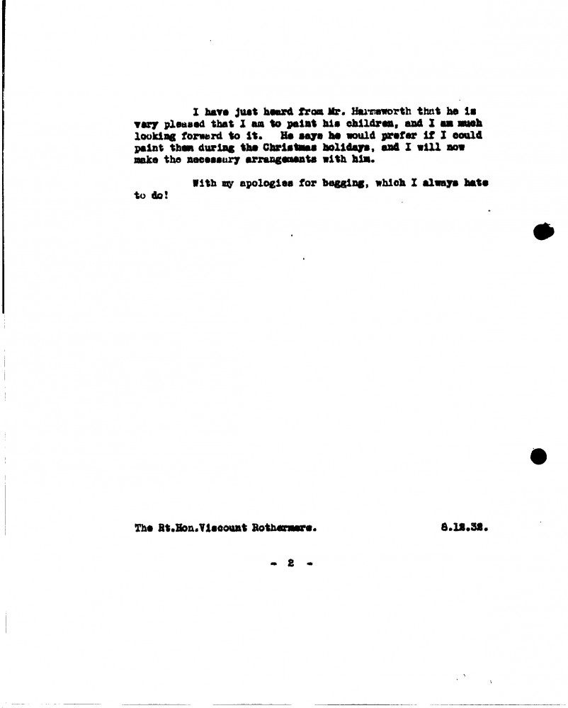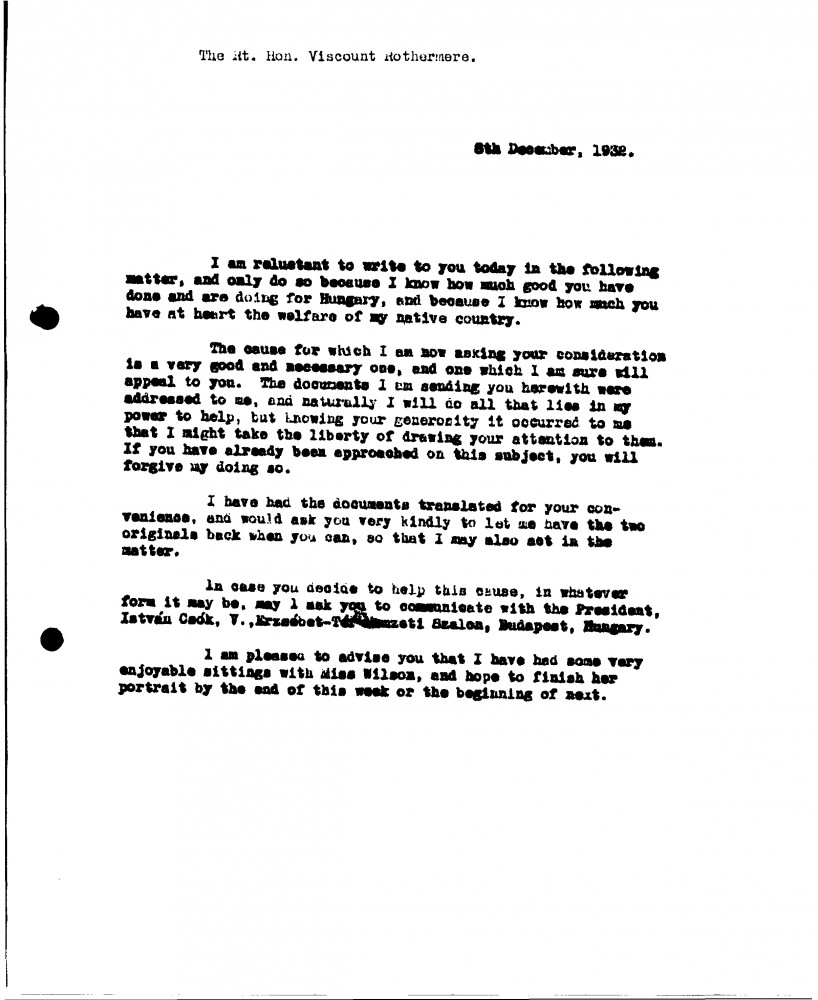 De László asks if Lord Rothermere will contribute to a Hungarian cause. Sittings with Miss Wilson [7760]. Esmond Harmsworth is pleased de László is to paint his children [4774][4776][4782].