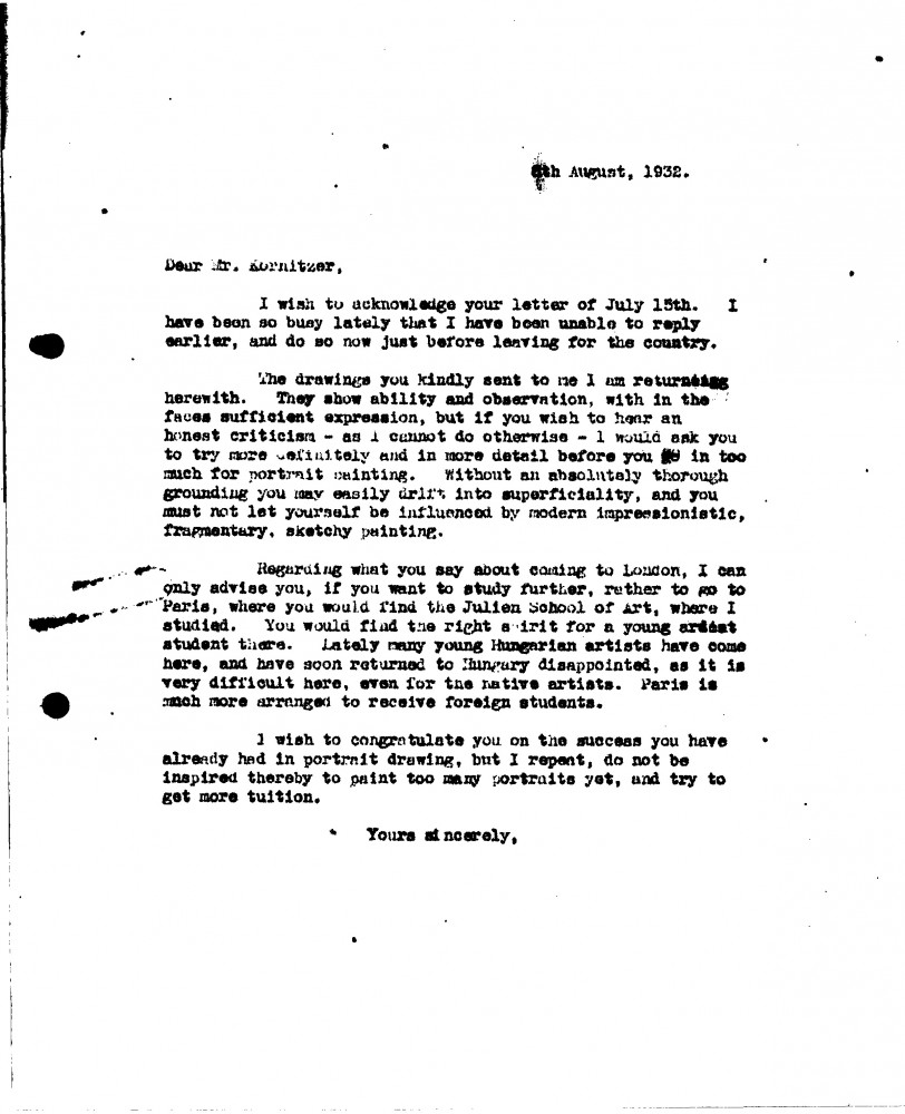 De László observes that the drawings Kornitzer sent show ability but that he would benefit from tuition. He recommends Kornitzer travels to Paris rather than London if he wishes to pursue further studies.