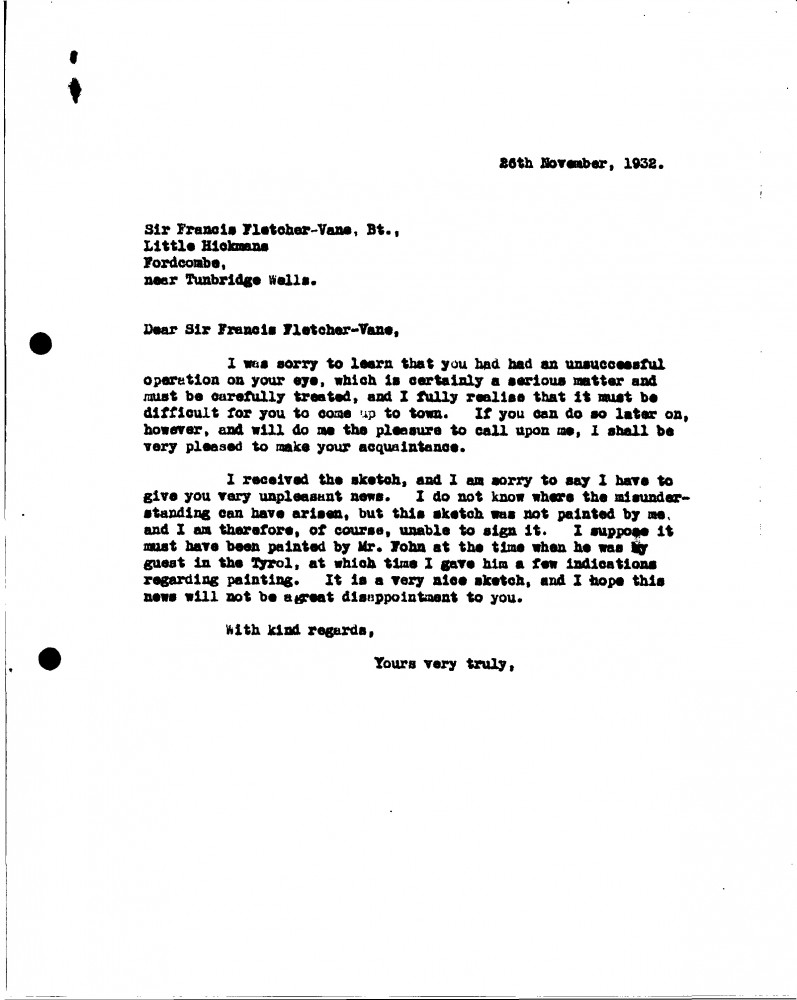 De László has received the sketch sent by Fletcher Vane. He is sorry to report that it was not painted by him but rather likely by Fohn when he was a guest of de László's in the Tyrol.