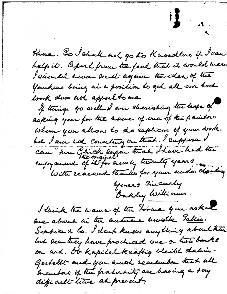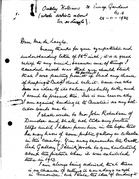 Owing to straitened financial circumstances, Williams is obliged to sell the portrait of his daughter [7741]. As de László suggested, he will contact John Robertson. Broaches the idea of having a copy made.